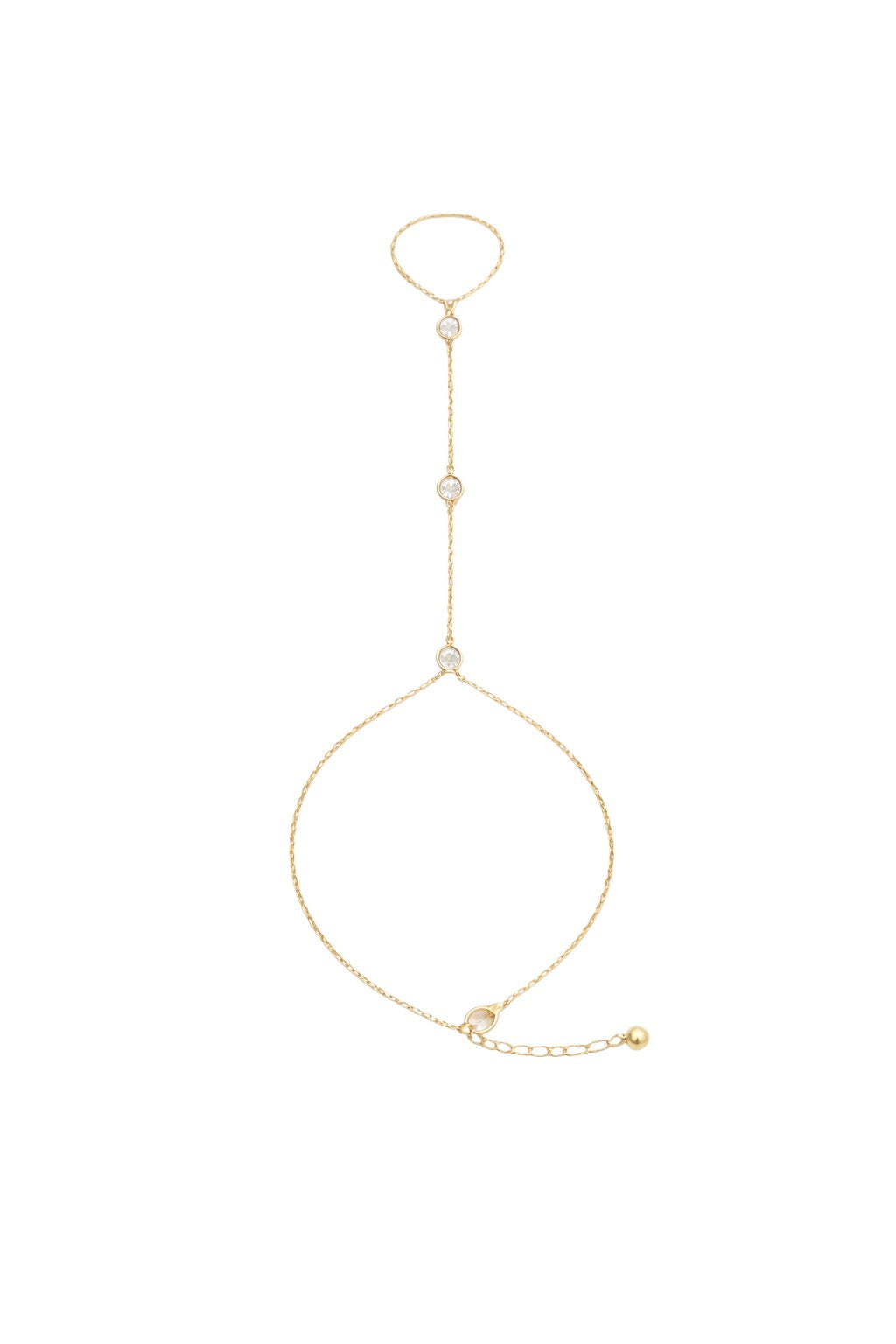 Compuesto por una fina cadena de acero inoxidable bañada en oro , conecta la muñeca a un delicado anillo alrededor del dedo, adornado con tres cristales en forma de lágrima .