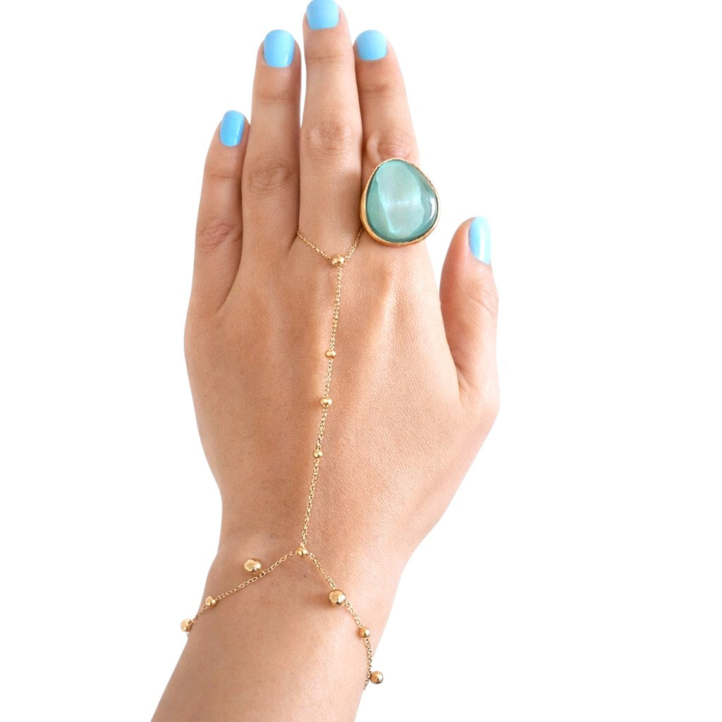 Compuesto por una delicada cadena adornada con pequeñas cuentas doradas, une elegantemente la muñeca con uno de los dedos para un efecto elegante y refinado. Su diseño minimalista lo convierte en una pieza moderna y fácil de llevar, perfecta para el verano o para ocasiones especiales.