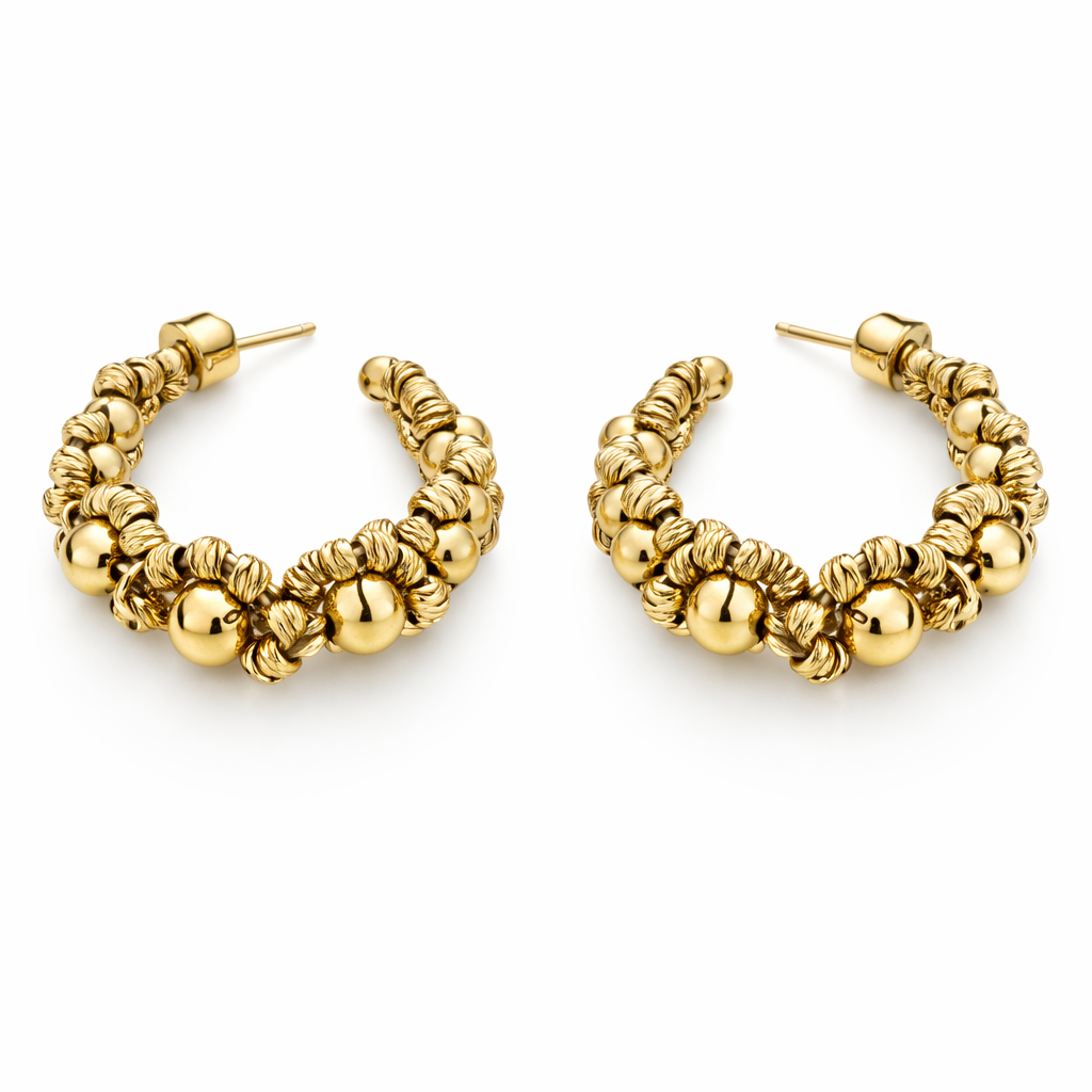 Dale un toque de elegancia atemporal a tu look con estos refinados aros dorados . Elaborados con cuentas de oro lisas y texturizadas , ofrecen un sutil juego de luz que realza el rostro y son ideales tanto para el día a día como para ocasiones especiales.