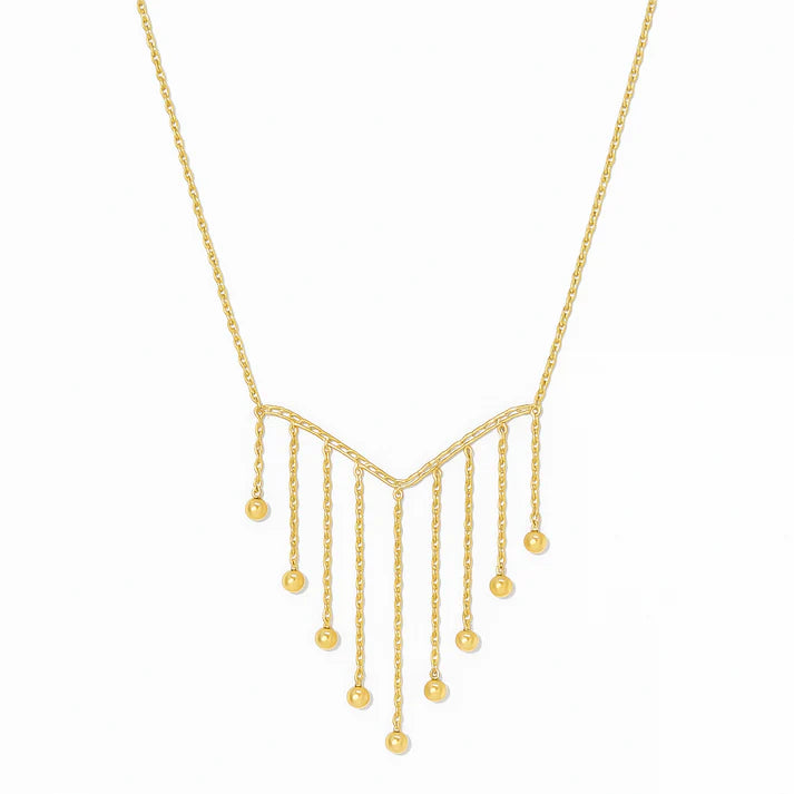 Su forma de V adornada con finas cadenas y pequeñas cuentas doradas crea un delicado y luminoso efecto cascada.