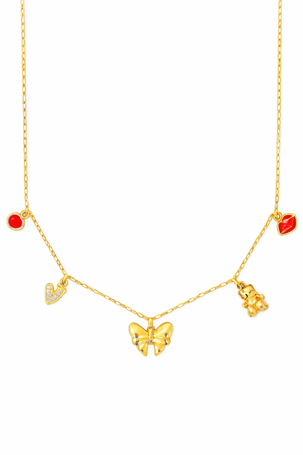 Sus charms —una pajarita, un corazón, labios rojos, un osito de peluche y pequeños círculos rojos— simbolizan la dulzura, el amor y la alegría de vivir. Una joya ideal para realzar tus looks, desde los más casuales hasta los más elegantes.