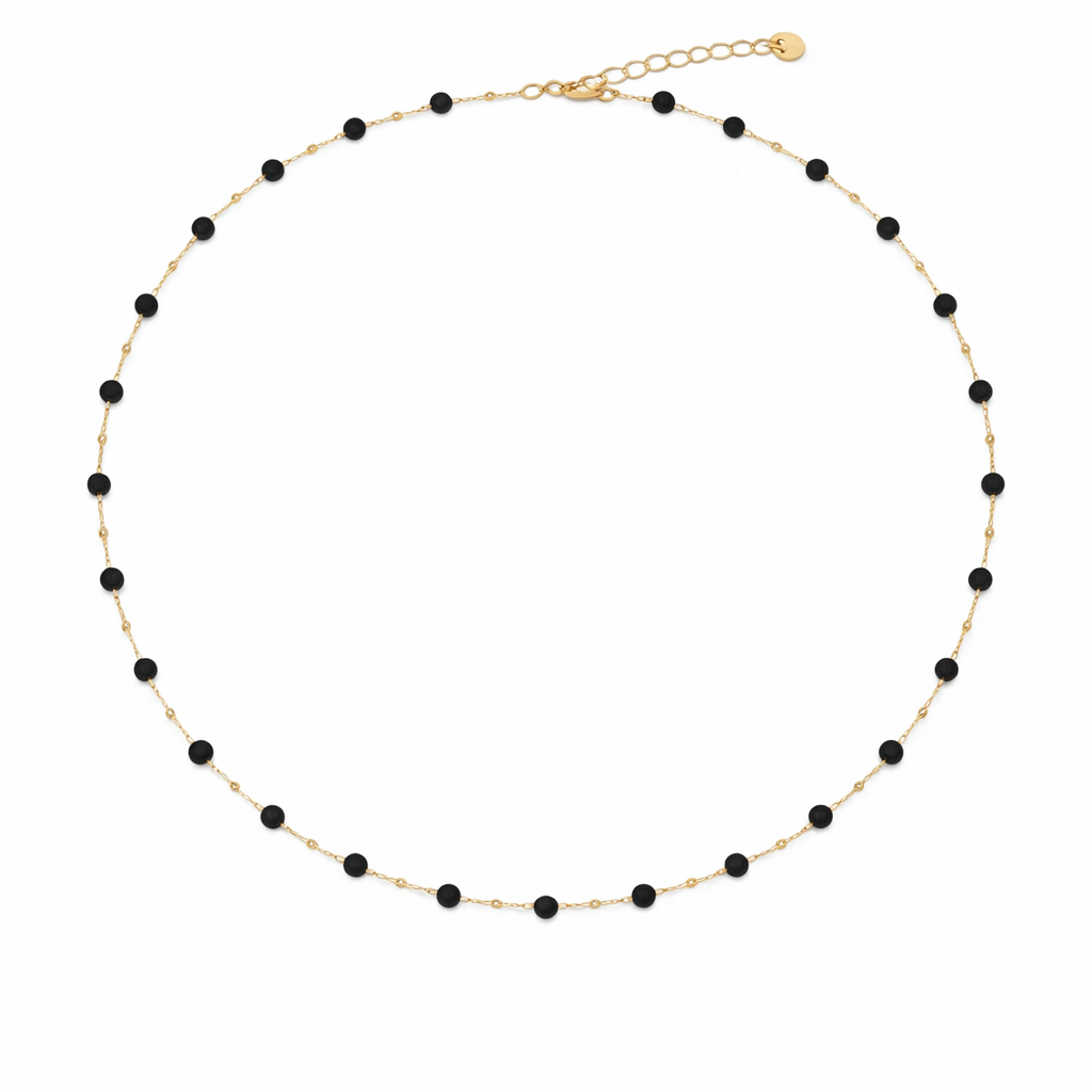 Este fino collar de acero inoxidable bañado en oro está adornado con pequeñas cuentas negras facetadas , montadas a intervalos regulares en una delicada cadena.