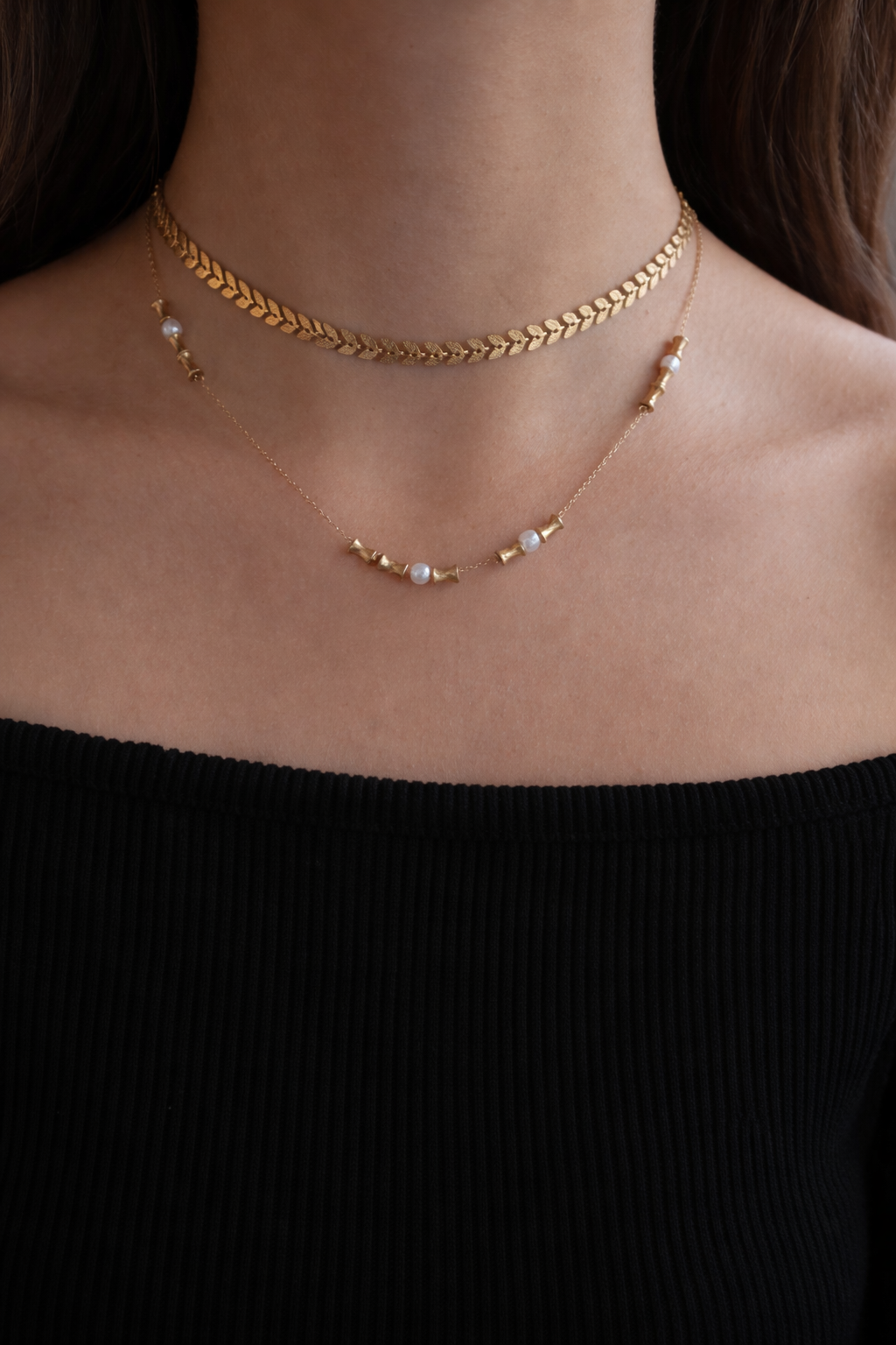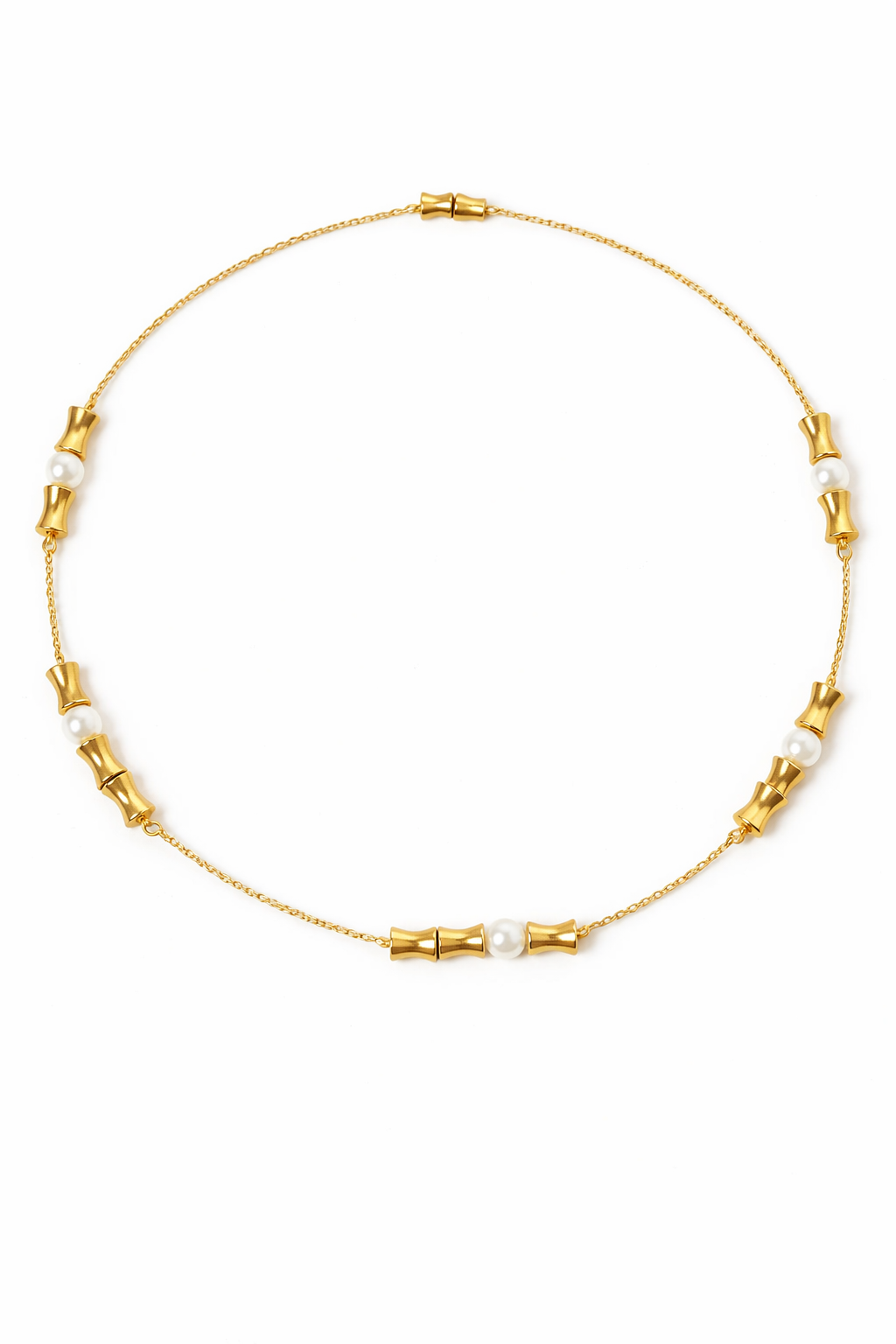 Este collar de acero inoxidable 316L combina la elegancia de las perlas blancas con la modernidad de los detalles geométricos en oro .