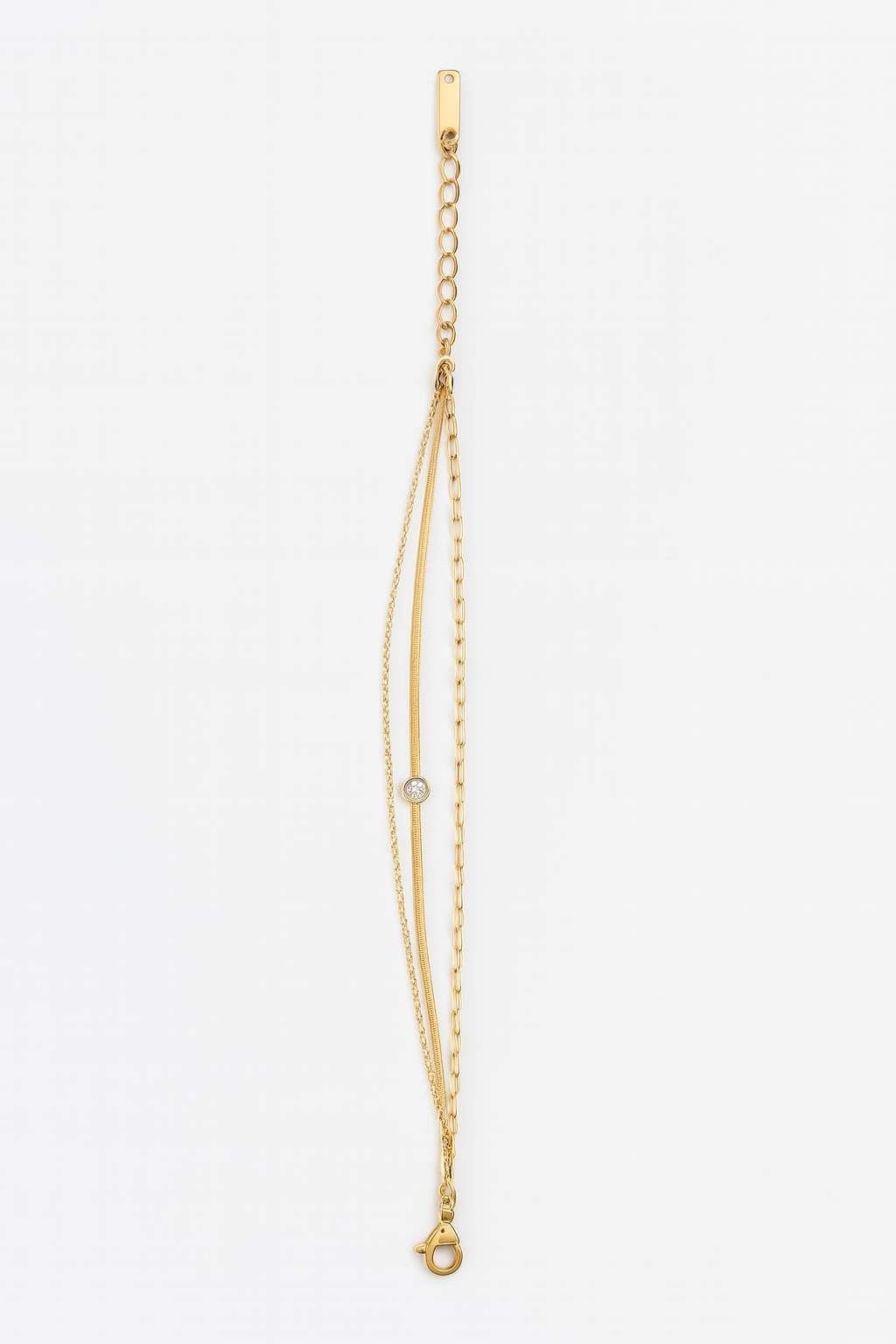 Apportez une touche d’élégance à votre poignet avec ce bracelet doré en acier inoxydable. Composé de fines chaînes entrelacées, dont une maille serpent et une délicate chaîne ornée d’un zircon, il reflète parfaitement la tendance du layering minimaliste.