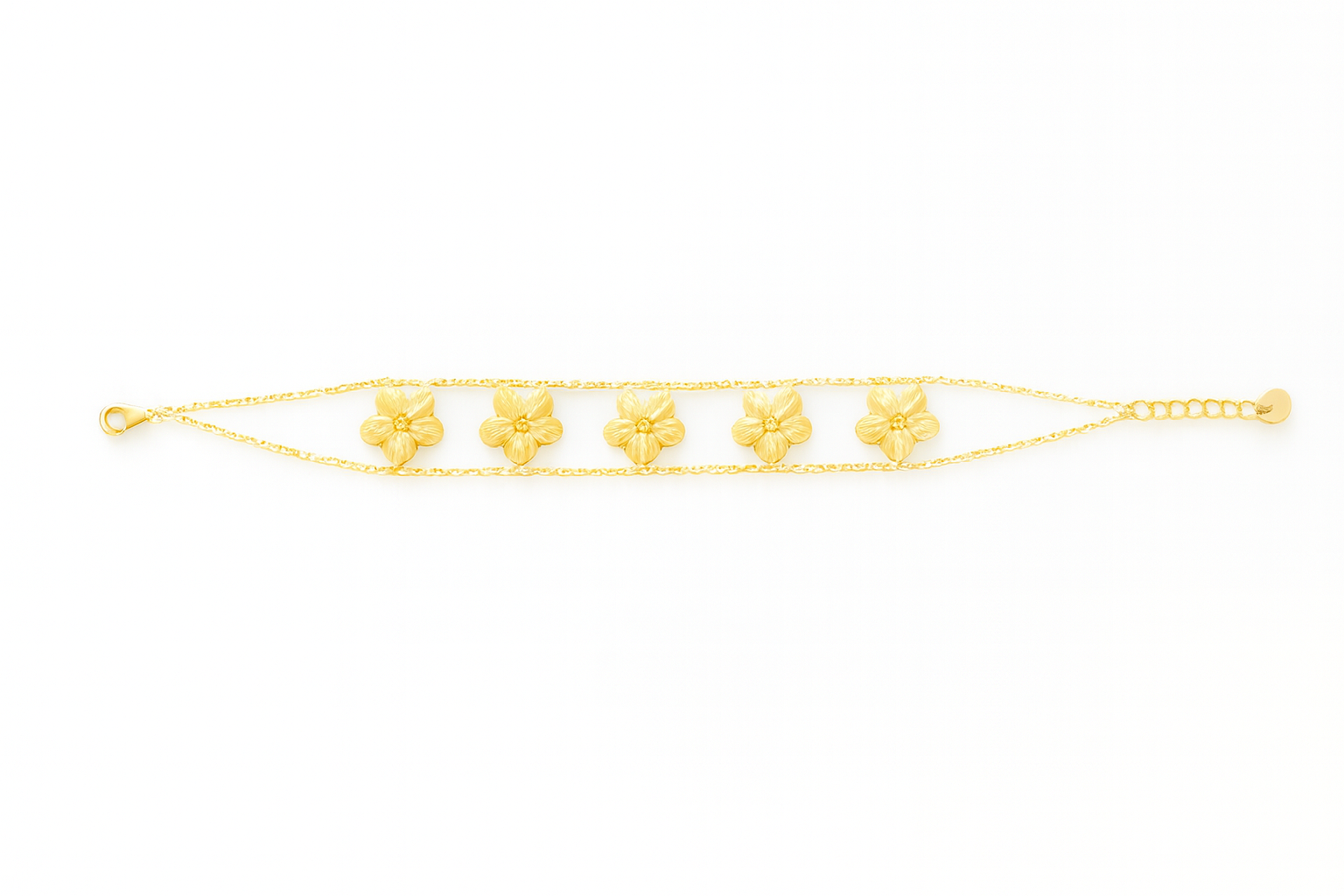 - Design : Enchaînement de cinq fleurs dorées finement gravées, reliées par une chaîne délicate